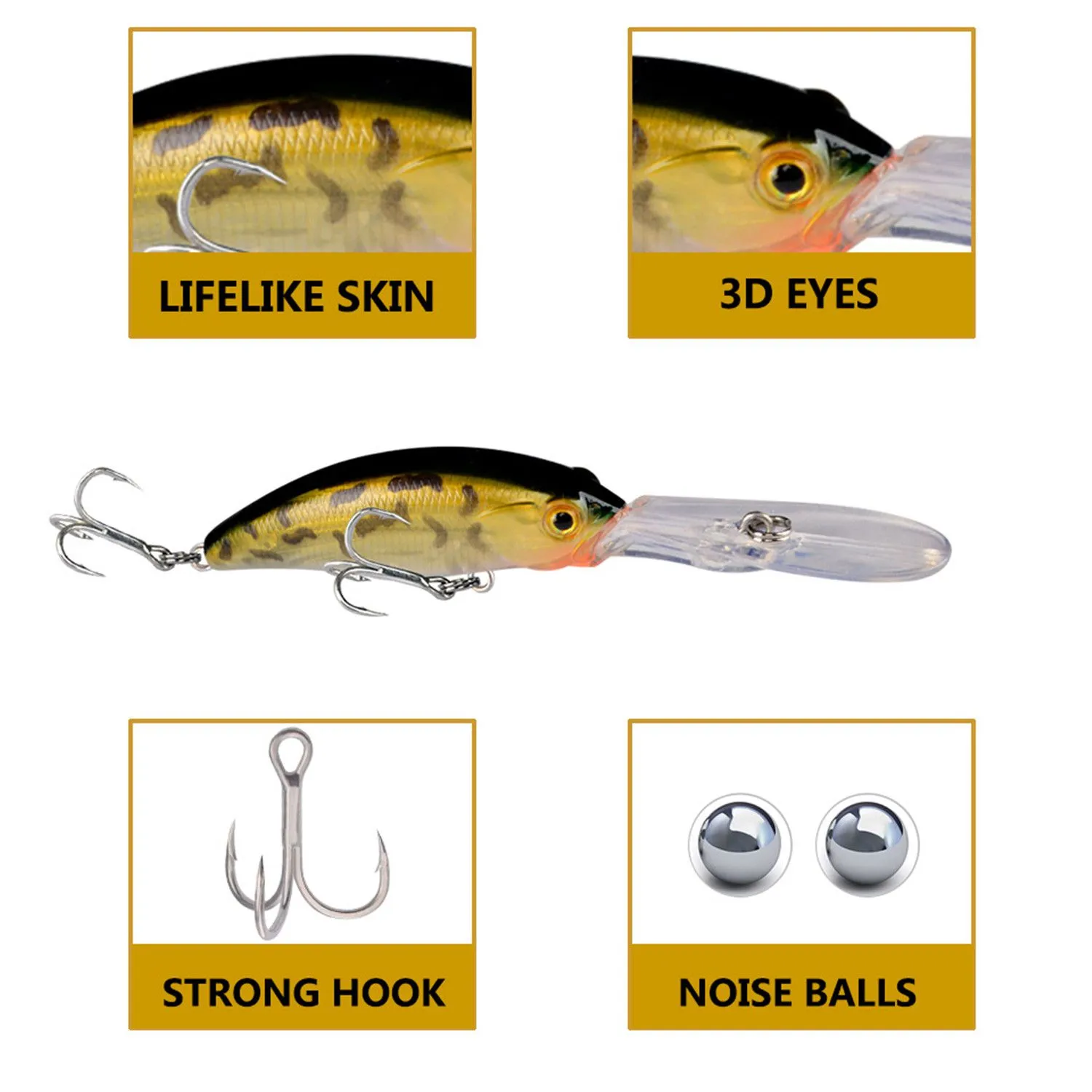 • Enhanced Diving Capability:  The floating minnow lure is designed with a plastic lip at the head. When the line is pulled, it can swiftly dive into the water. The length of the plastic lip determines the depth of the dive; a longer lip enables the minnow to reach deeper water levels. This is a great advantage for bass fishing as it allows you to target bass at different depths