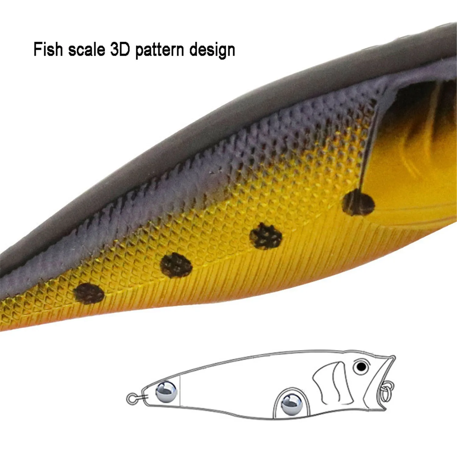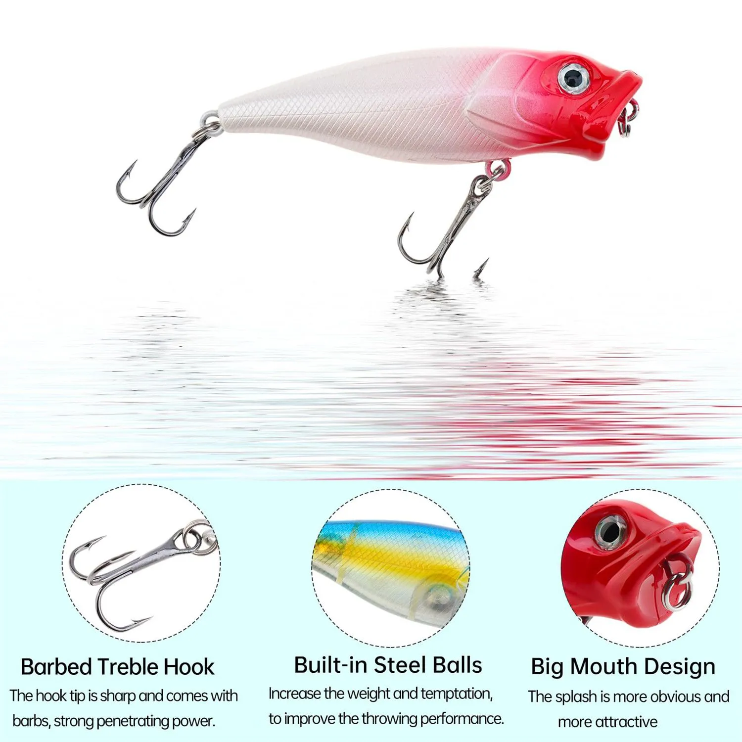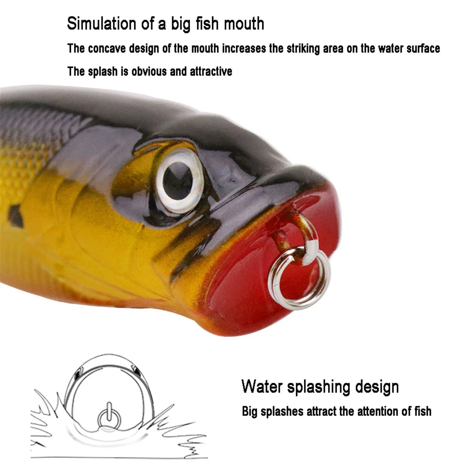 • Exceptionally Lifelike Design – The popper lure features vivid 3D eyes that seem to follow the movements around them, textured scales that mimic the feel of a real fish, and detailed gills and fins that add to its authenticity. This level of realism makes it irresistible to predatory fish, increasing your chances of a successful catch.