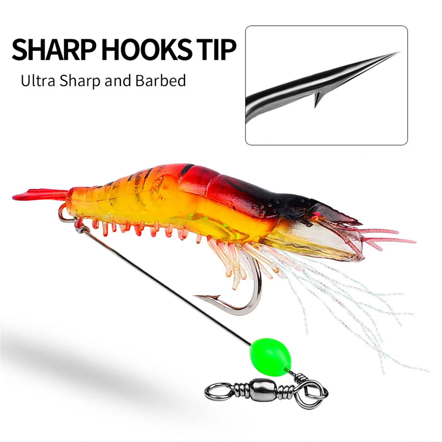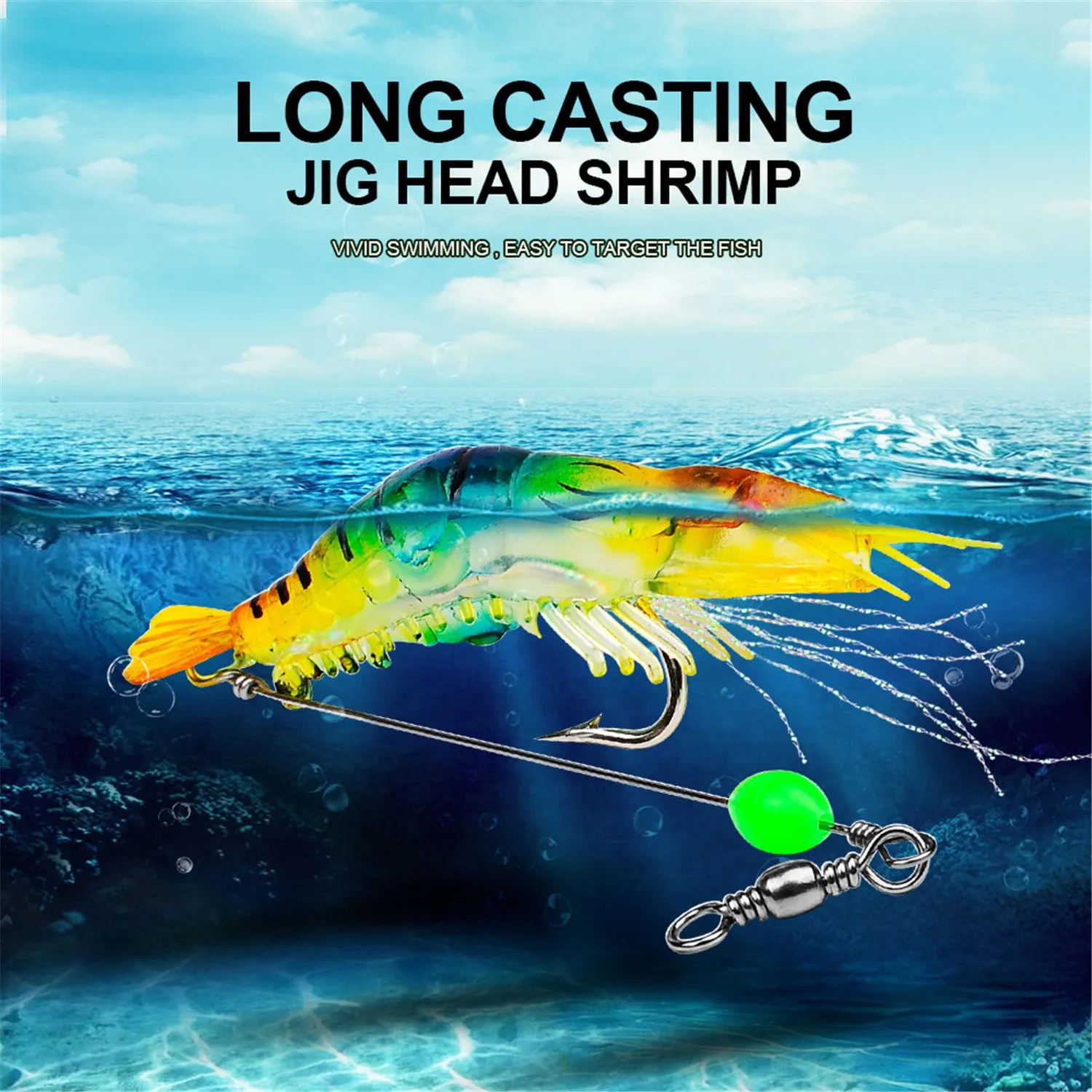 - GLOWING ALLURE The soft lure features luminous beads and feelers, which significantly amplify its appeal to fish. The light green and vibrantly colored shrimp design is capable of emitting a full glow, presenting an ideal option for night fishing enthusiasts. This luminescent property allows the bait to stand out in the dark waters, attracting the attention of nocturnal feeders and increasing the likelihood of a strike.